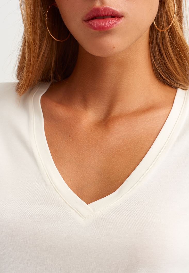 Krem Yumuşak Tuşeli V Yaka Tişört ( MODAL )