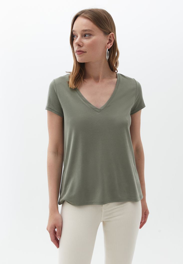 • Bayan Yeşil Yumuşak Tuşeli V Yaka Tişört ( MODAL )