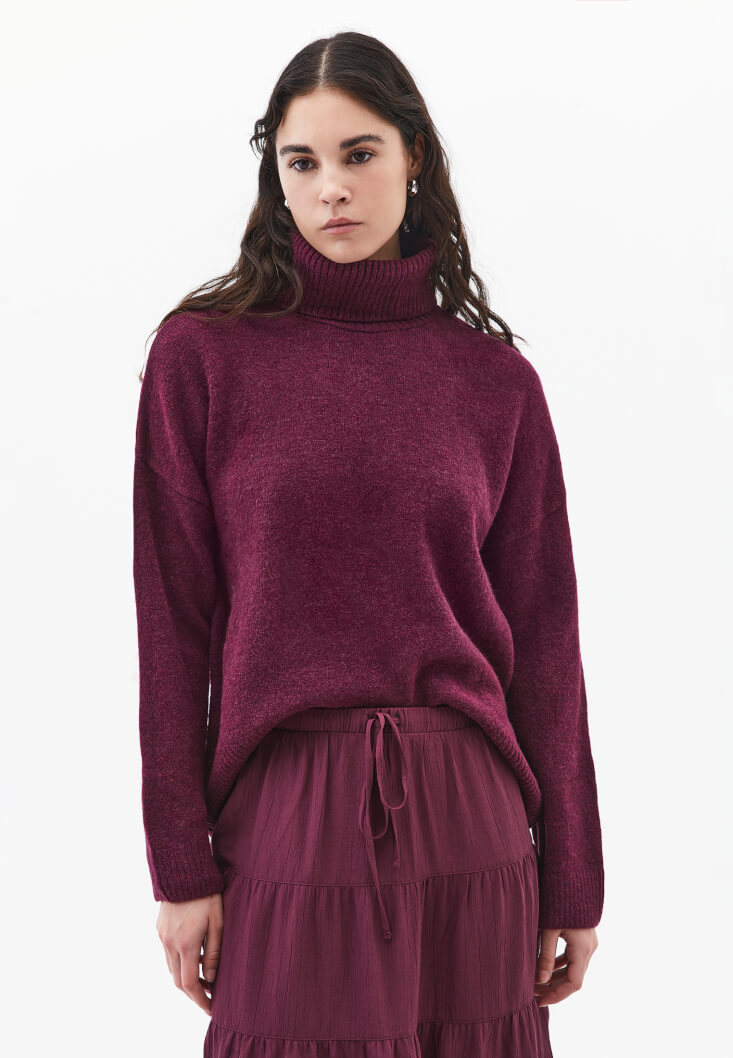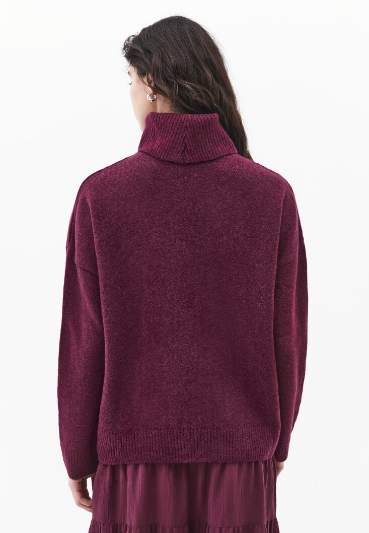 Yün karışımlı sıcak triko, bedenden uzak loose fit, uzun kollu, balıkçı yaka, yaka ve kol/etek ucu jakarlı örgü.