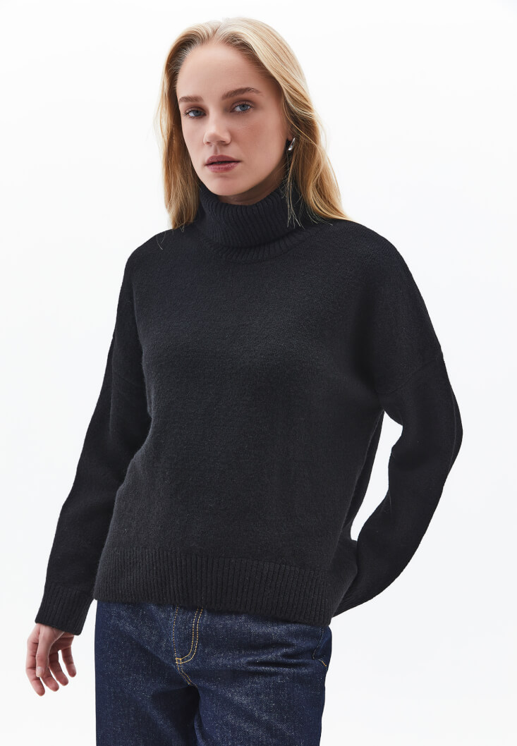 • Bayan Siyah Yün Karışımlı Balıkçı Yaka Kazak
