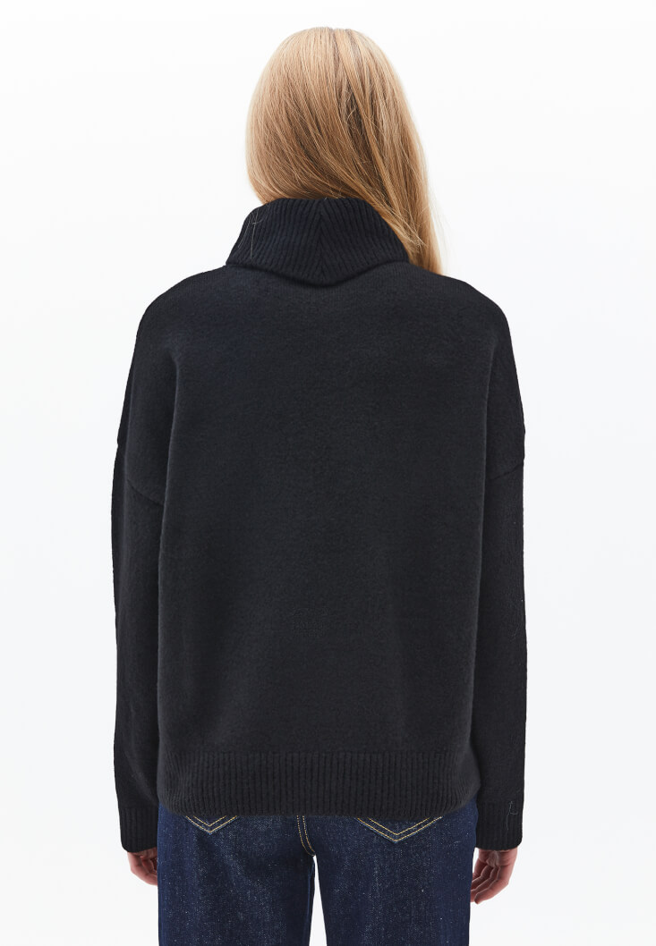 Yün karışımlı sıcak triko, bedenden uzak loose fit, uzun kollu, balıkçı yaka, yaka ve kol/etek ucu jakarlı örgü.
