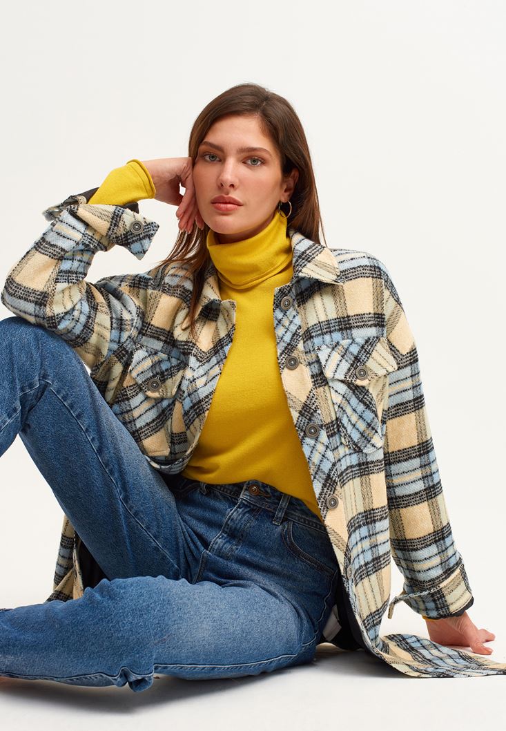 Yün karışımlı örme triko, yüksek yaka, uzun kollu, bedeni saran rahat kalıp, standart boy.