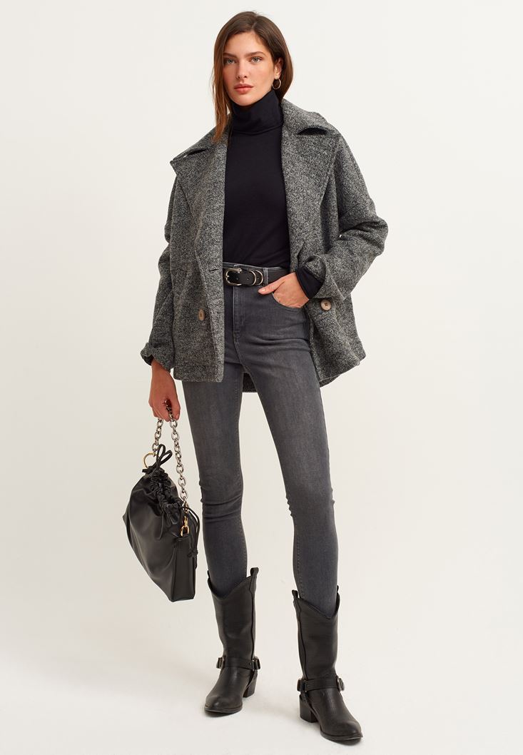 Yün karışımlı örme triko, yüksek yaka, uzun kollu, bedeni saran rahat kalıp, standart boy.
