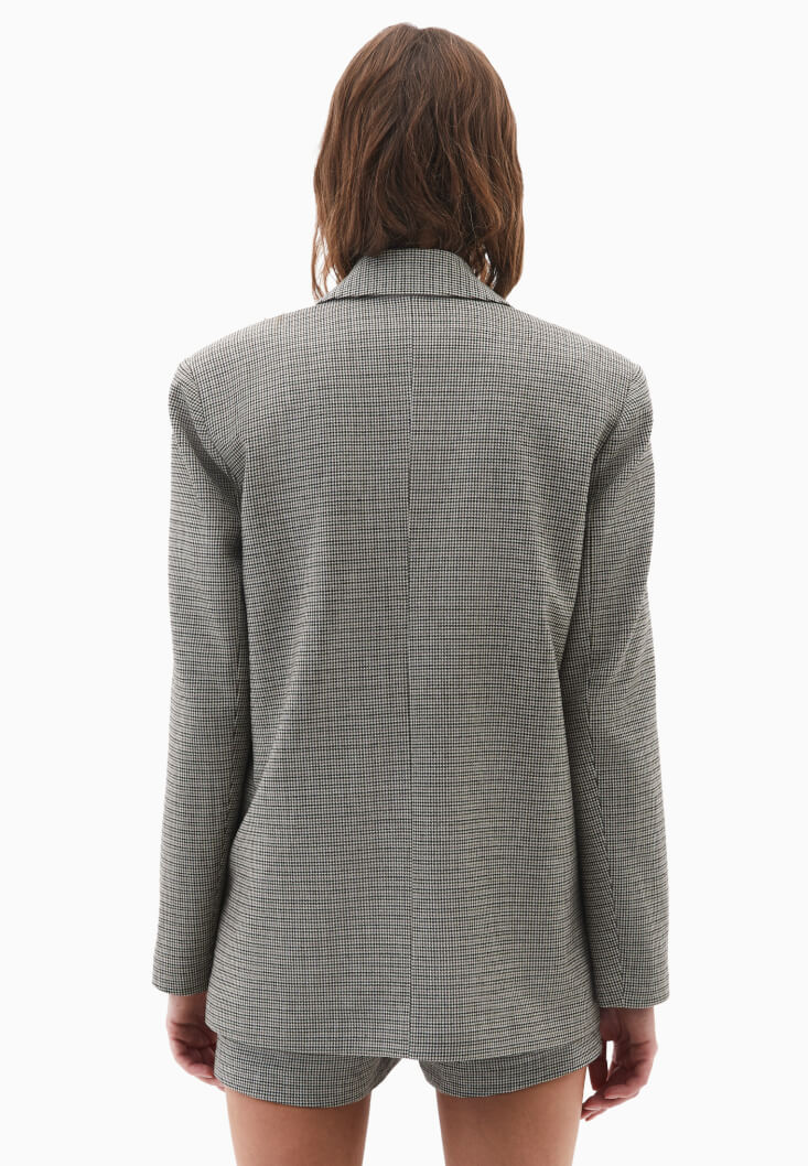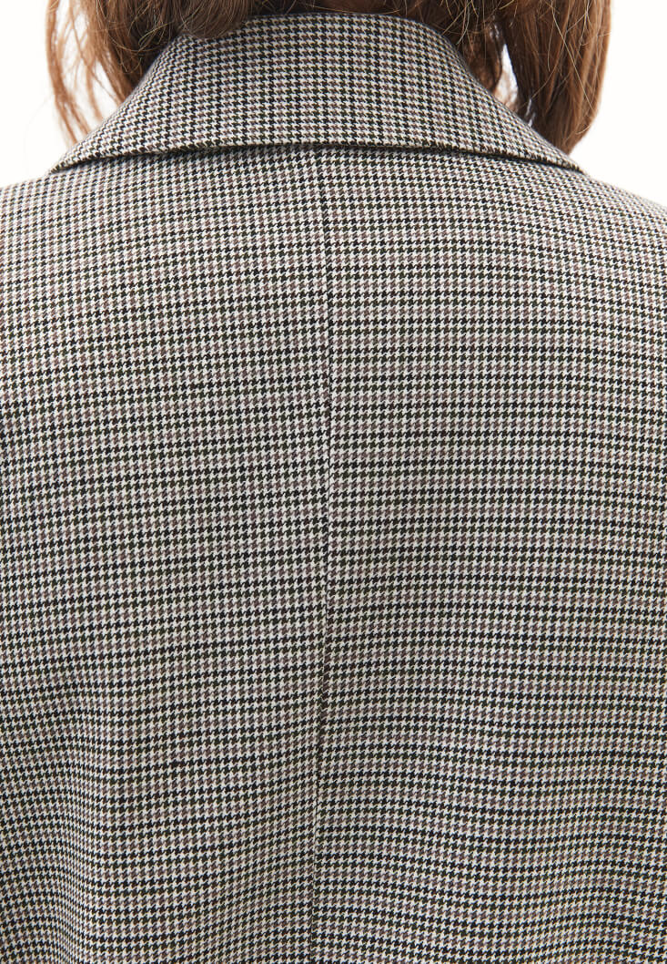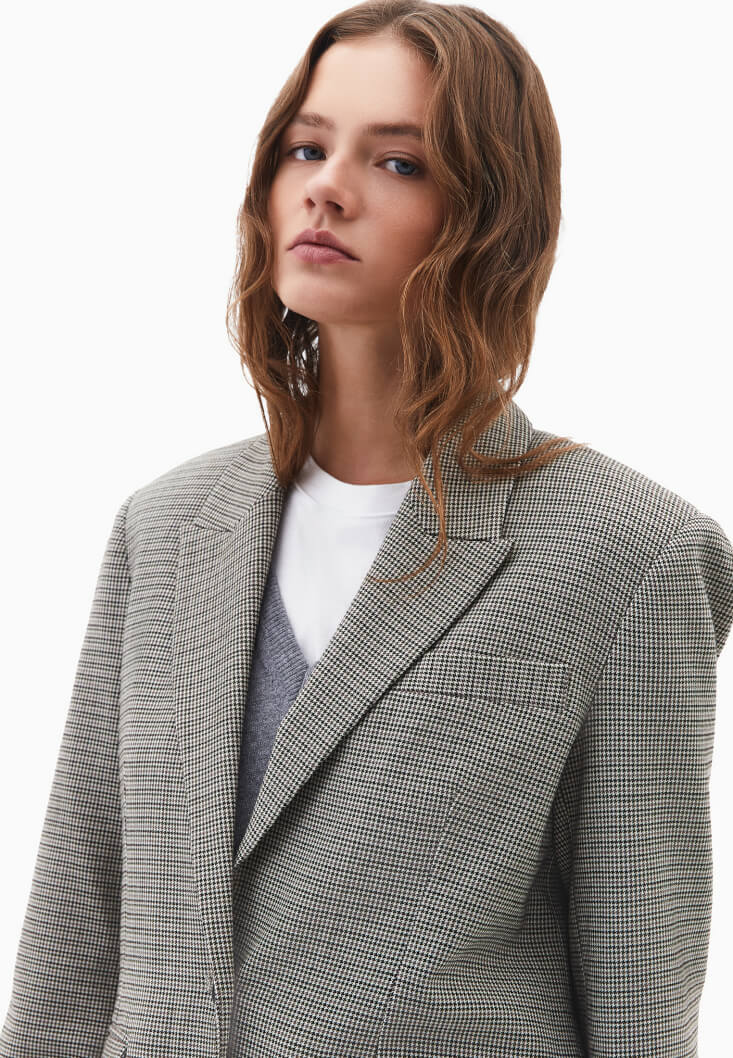 Yün ve viskon karışımlı özel doku, bedenden uzak boyfriend fit, uzun kollu, düğme kapamalı, iki cepli, içi astarlı.