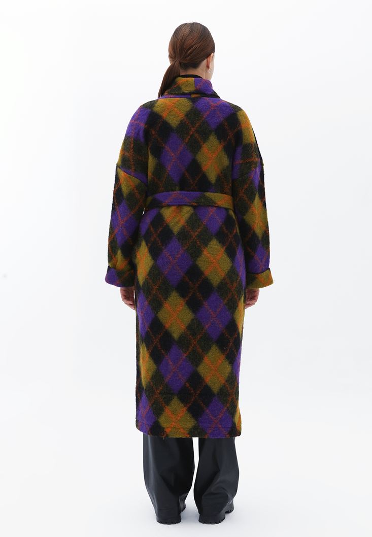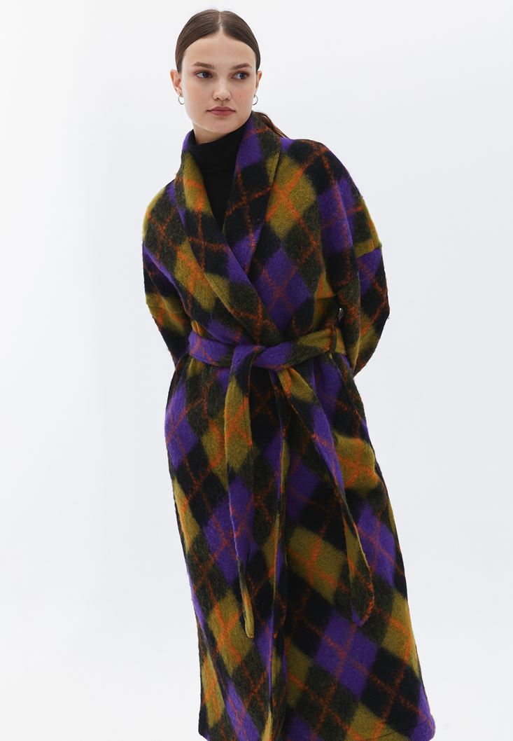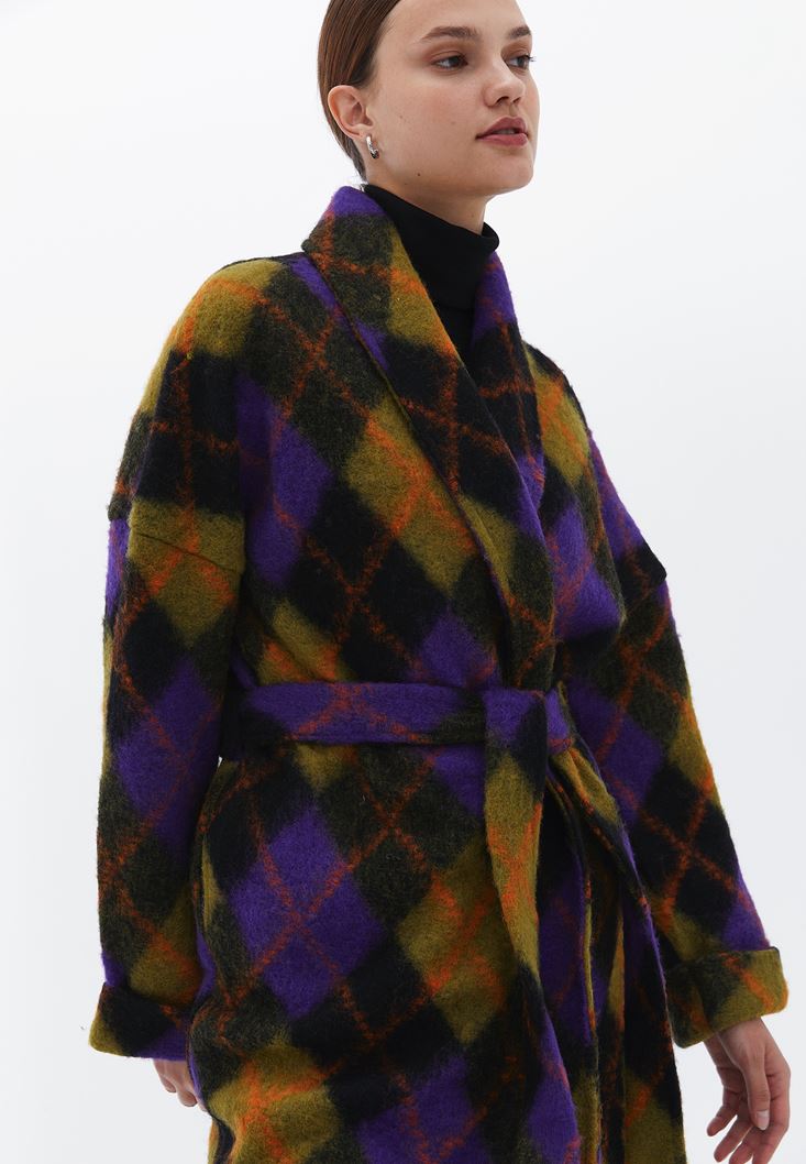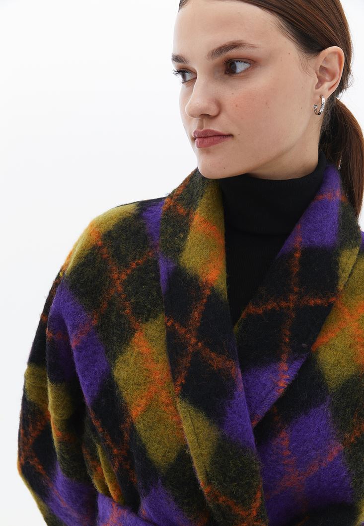 • Bayan Çok Renkli Yün Karışımlı Ekoseli Kaban