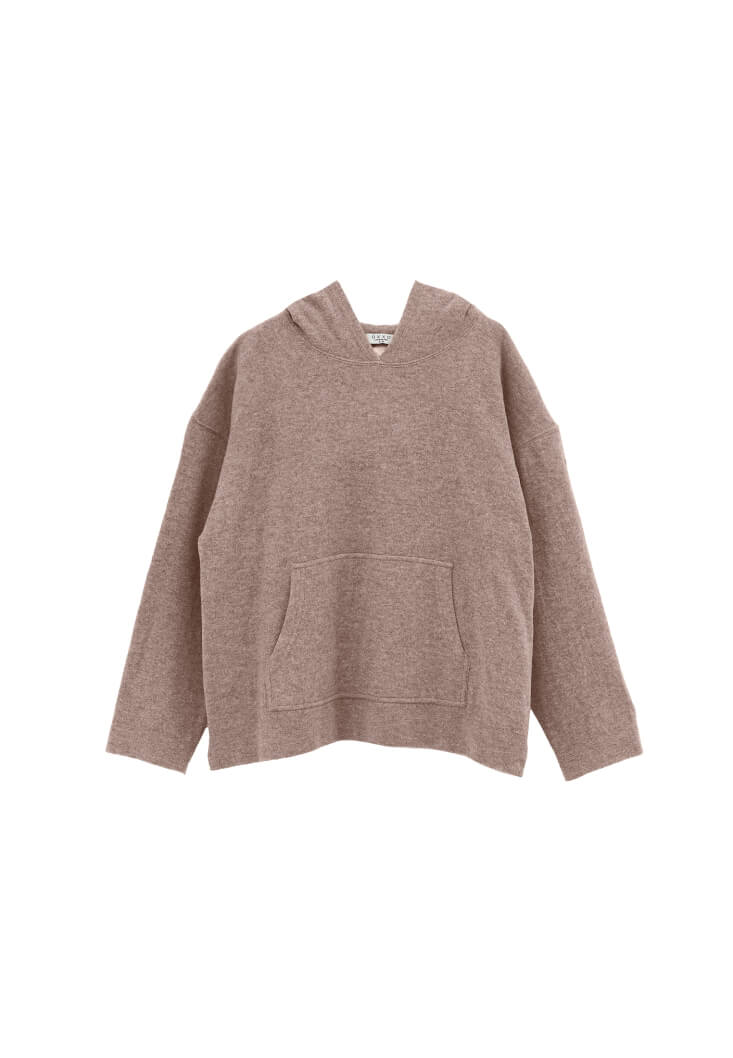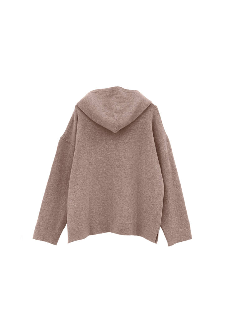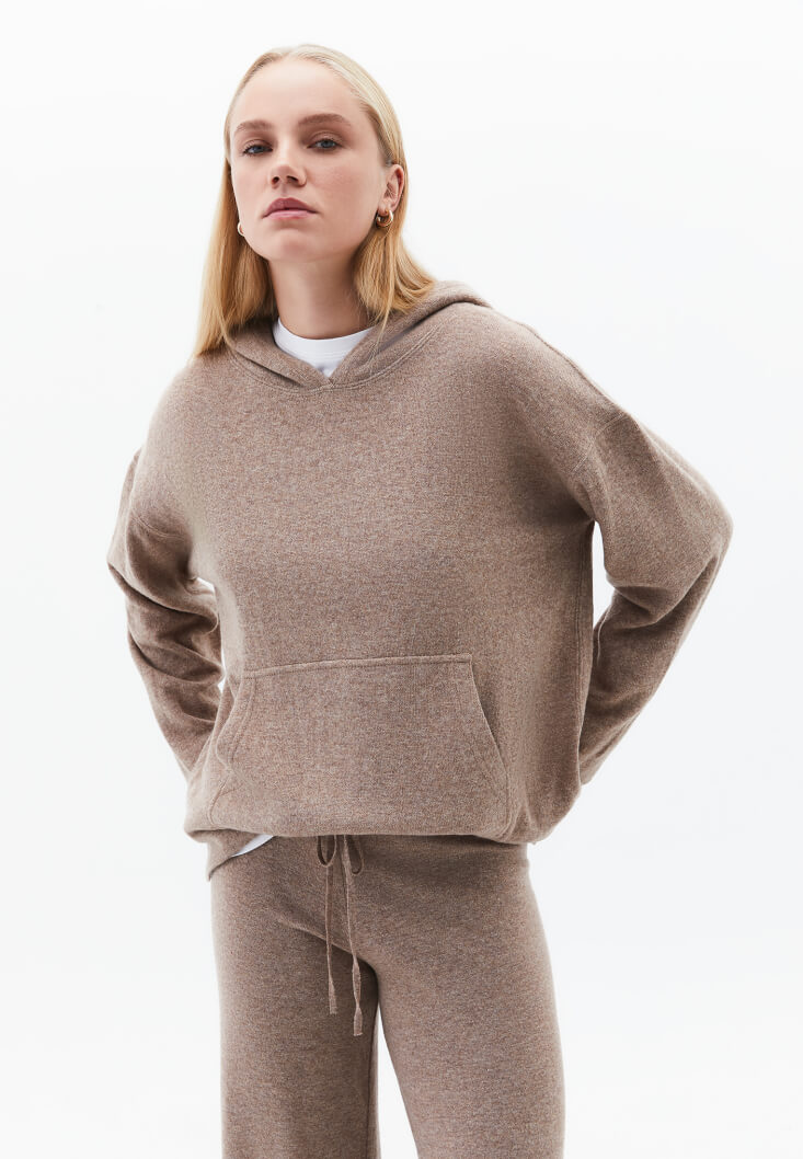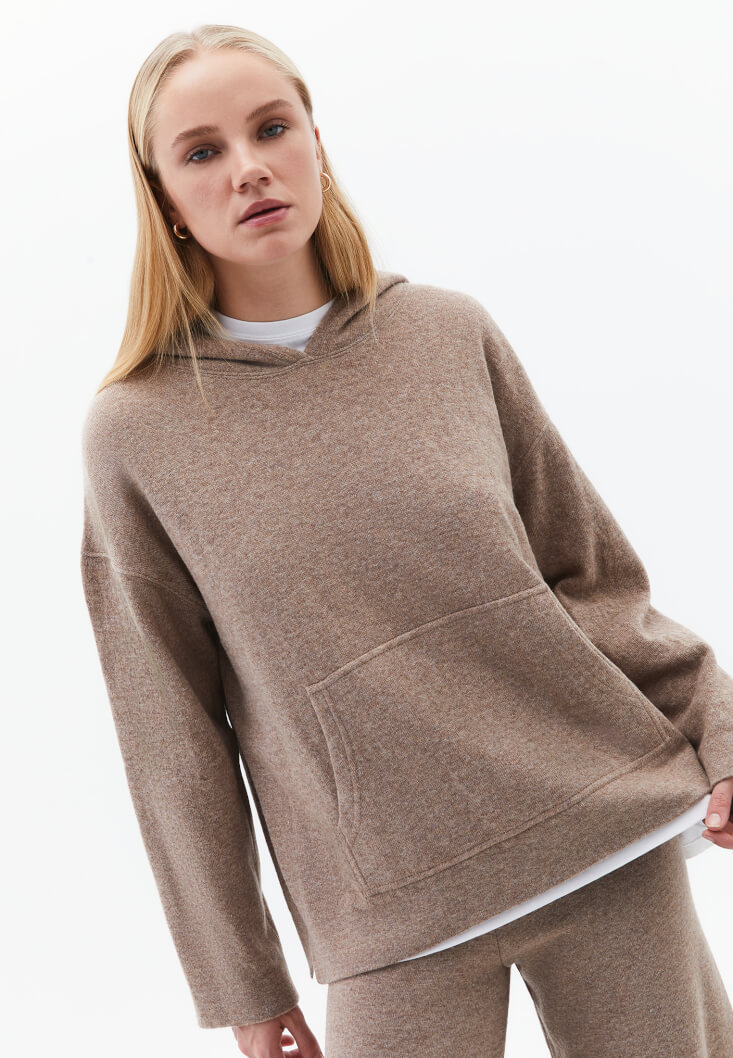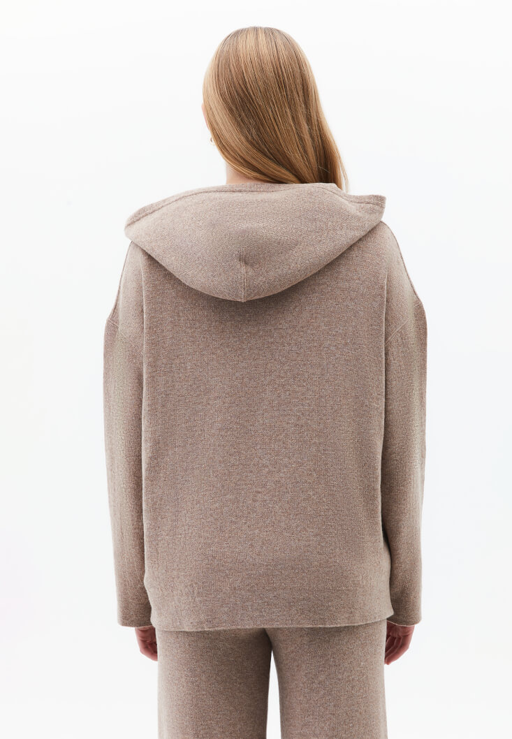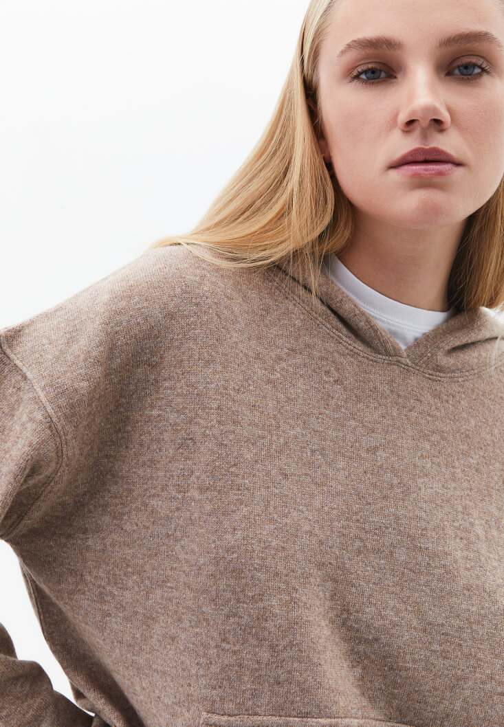 Yün ve viskon karışımlı triko, bedenden uzak loose fit, kapüşonlu, uzun kollu, ön kısmı cep detaylı.