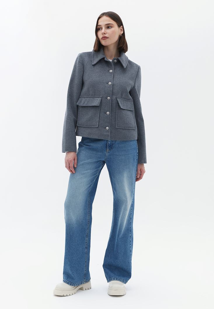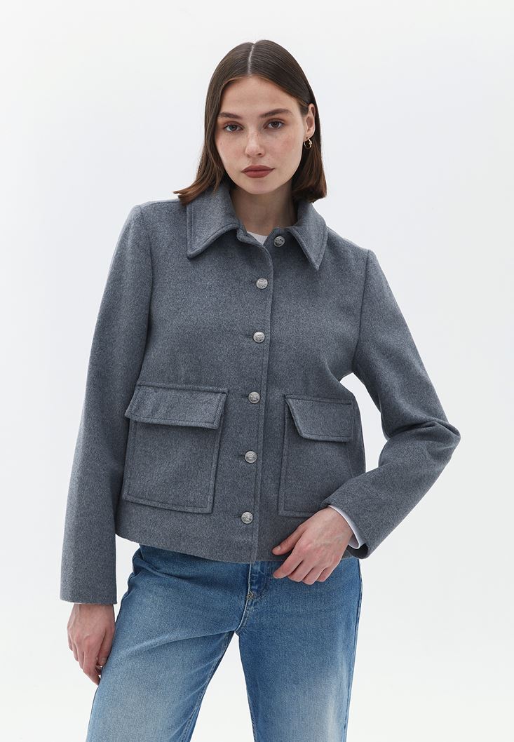 Yün karışımlı özel doku, dokulu düğme tasarımı, kapaklı iki cep, içi astarlı, gömlek yaka, bedenden uzak loose fit.
