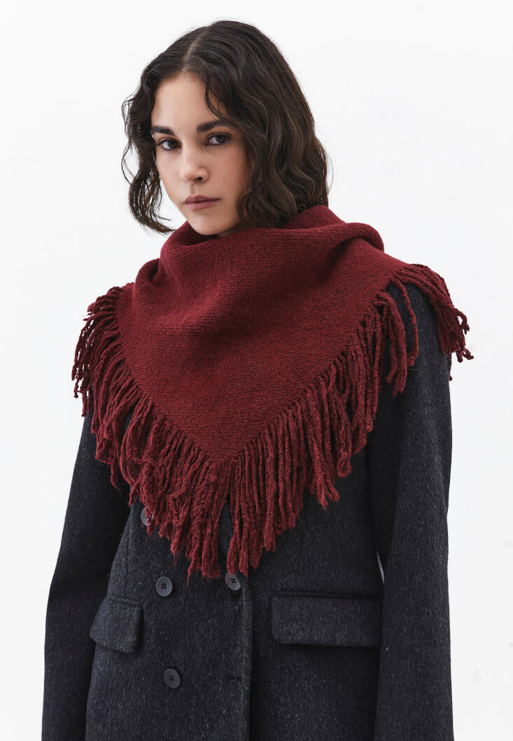 • Bayan Bordo Yün Karışımlı Püsküllü Şal