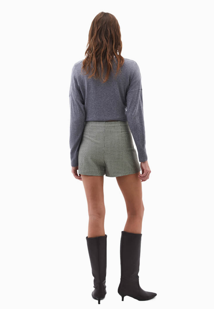 Yün karışımlı kumaşı sayesinde sıcaklık sunan bu şort etek, şık tasarımı ve düğme detaylı görünümüyle klasik ve modern çizgiyi bir araya getiriyor. Mini boy tasarımı enerjik bir duruş kazandırırken, şort detayı sayesinde gün boyu rahat hareket imkânı sağlar.