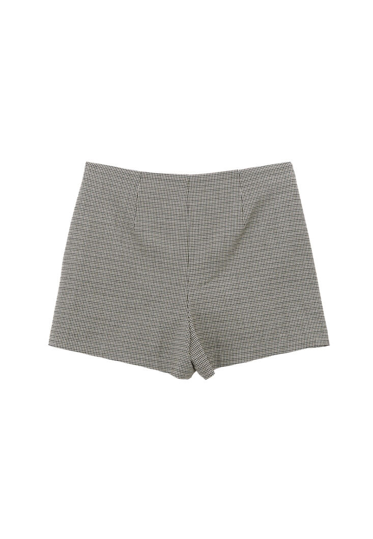 Yün ve viskon karışımlı özel doku, bedene yakın fit, ultra yüksek bel, mini boy, ön kısmı düğme kapamalı, şort detaylı, yan kısmı fermuar kapamalı.