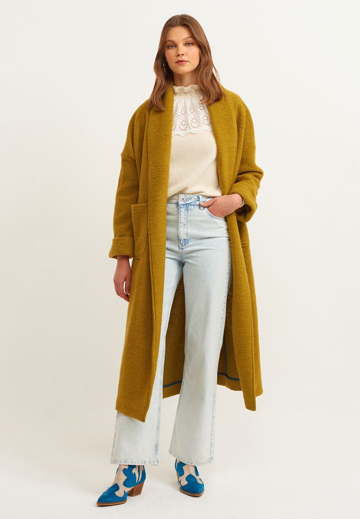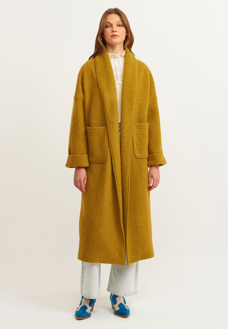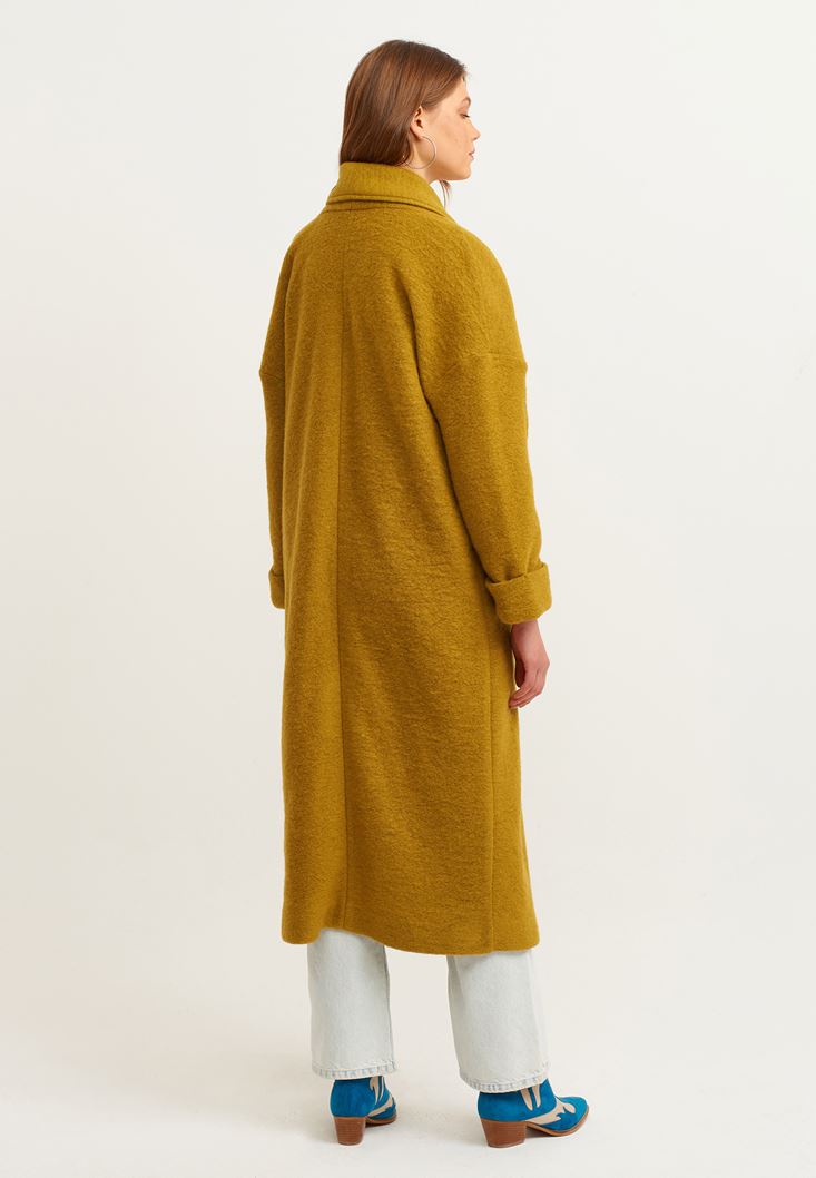 Yün karışımlı hoş doku, bedenden uzak oversize fit, iki cepli, uzun boy kesimi, katlama detaylı kol ucu.