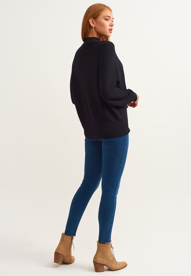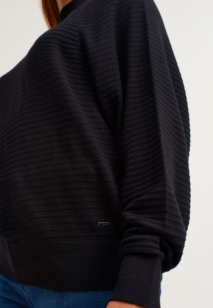 Yün karışımlı örme triko, yüksek yaka, belden oturan form, uzun kollu, fitilli doku, yarasa kol kesimi.