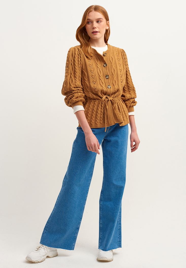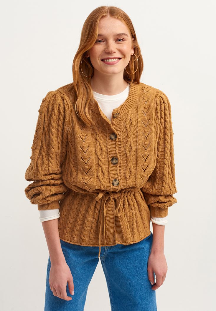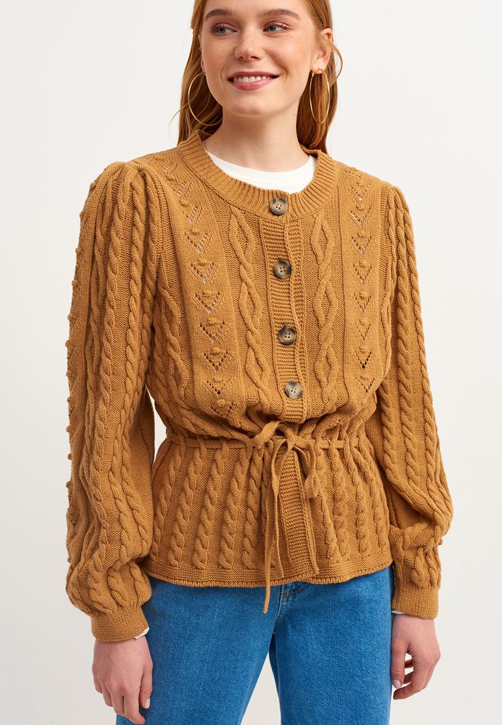 Pamuk karışımlı özel triko doku, düğmeli ve belden bağlama detaylı, ajurlu örgü, sıfır yaka.