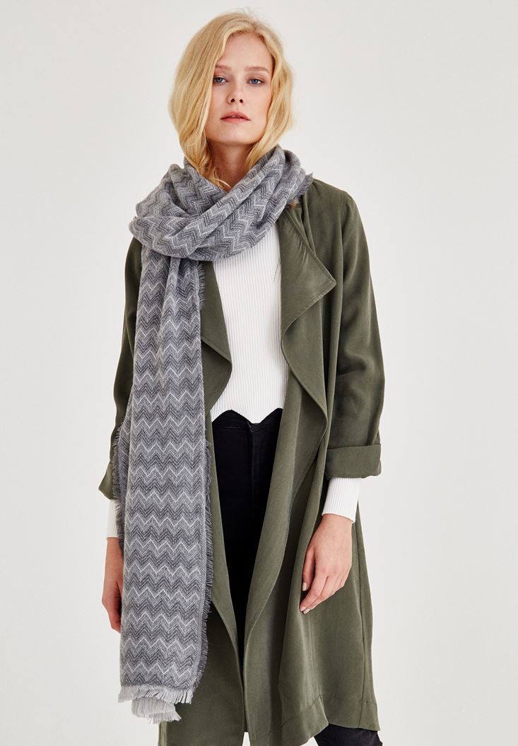 Gri Zigzag Desenli Püskül Detaylı Şal