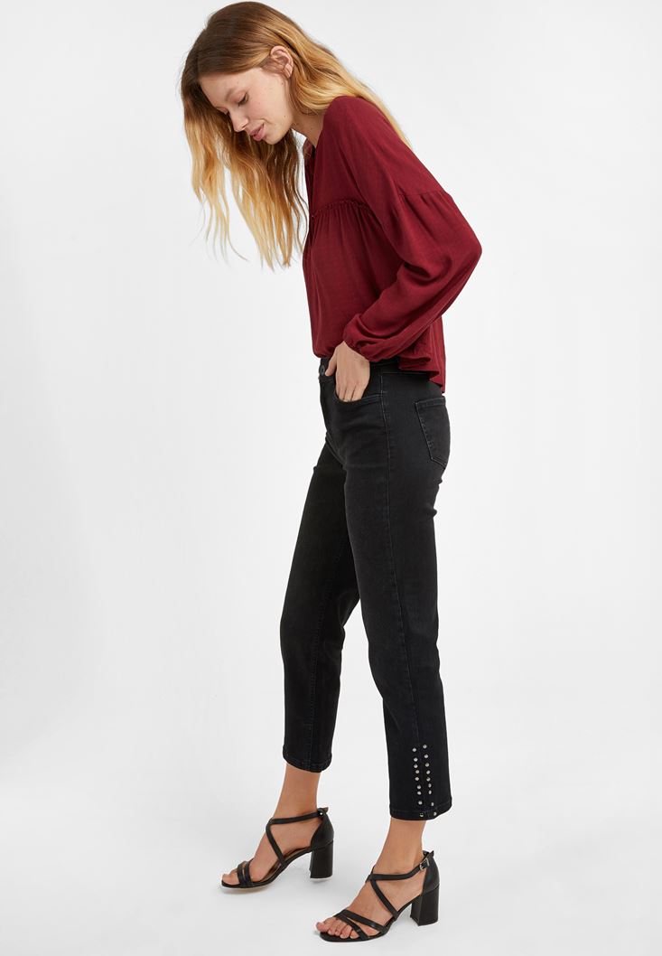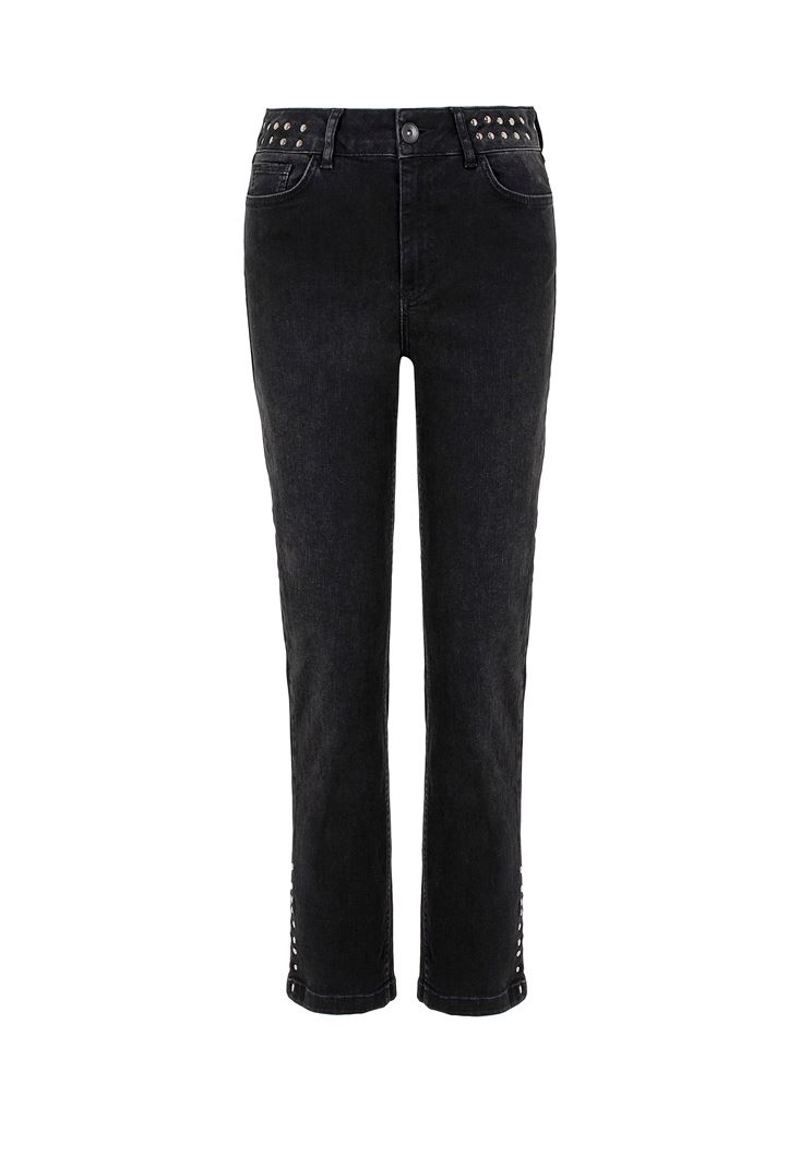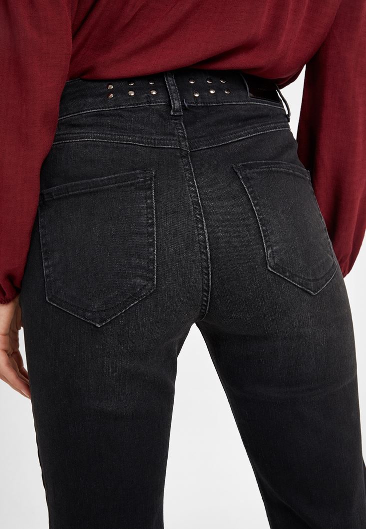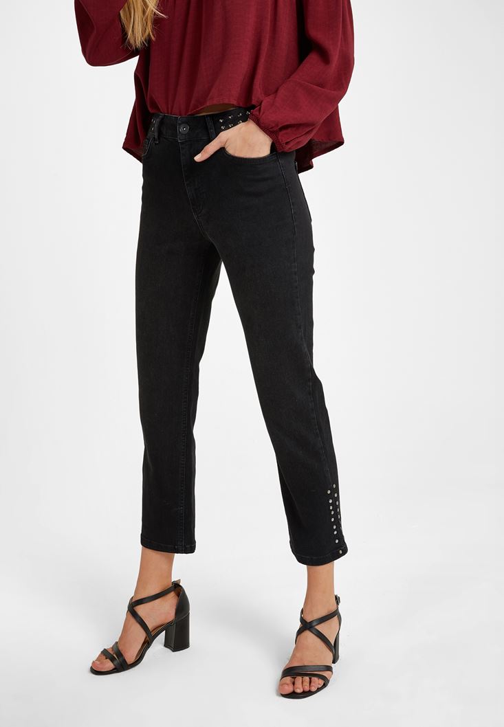 • Bayan Siyah Zımba Detaylı Denim Pantolon
