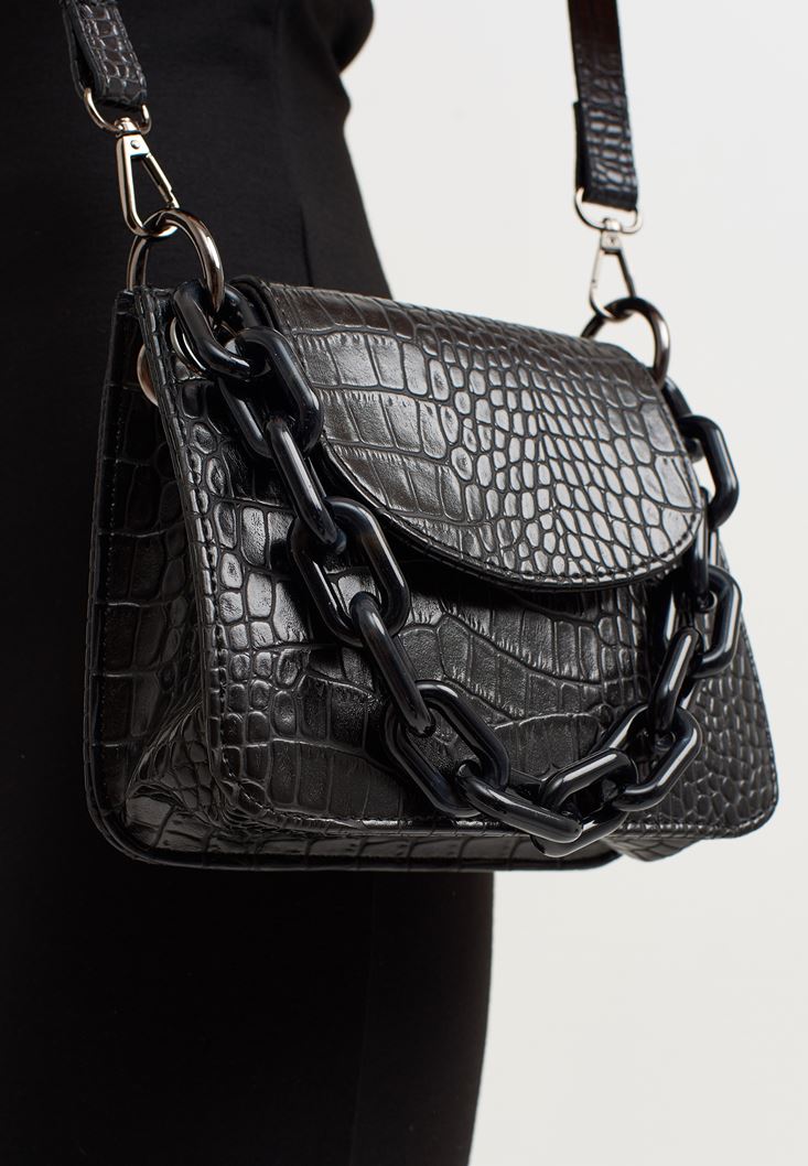 Zincir Detaylı Askılı Çanta modeli. Dokulu derisi ve kalın zincir detayı ile dikkat çeken askılı çanta şimdi seninle... Yuvarlak kenarlı kapak tasarımı ve uzun askı ayrıntısı ile kombinlerini büyüleyici bir şekilde tamamlamak mümkün. Gününe şıklık ve çarpıcılık katacak olan askılı çanta modelini topuklu terliklerle ve tokalı kemerlerle bir araya getirdiğin anda tüm dikkatler üzerinde toplanacak...