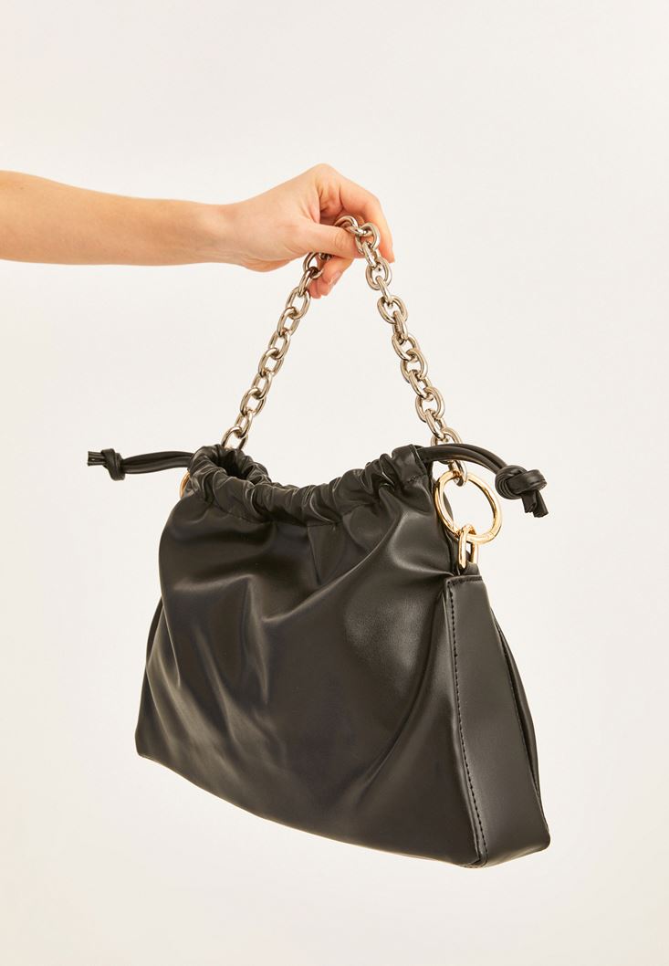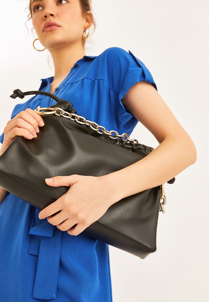 • Bayan Siyah Zincir Detaylı Büzgülü Çanta