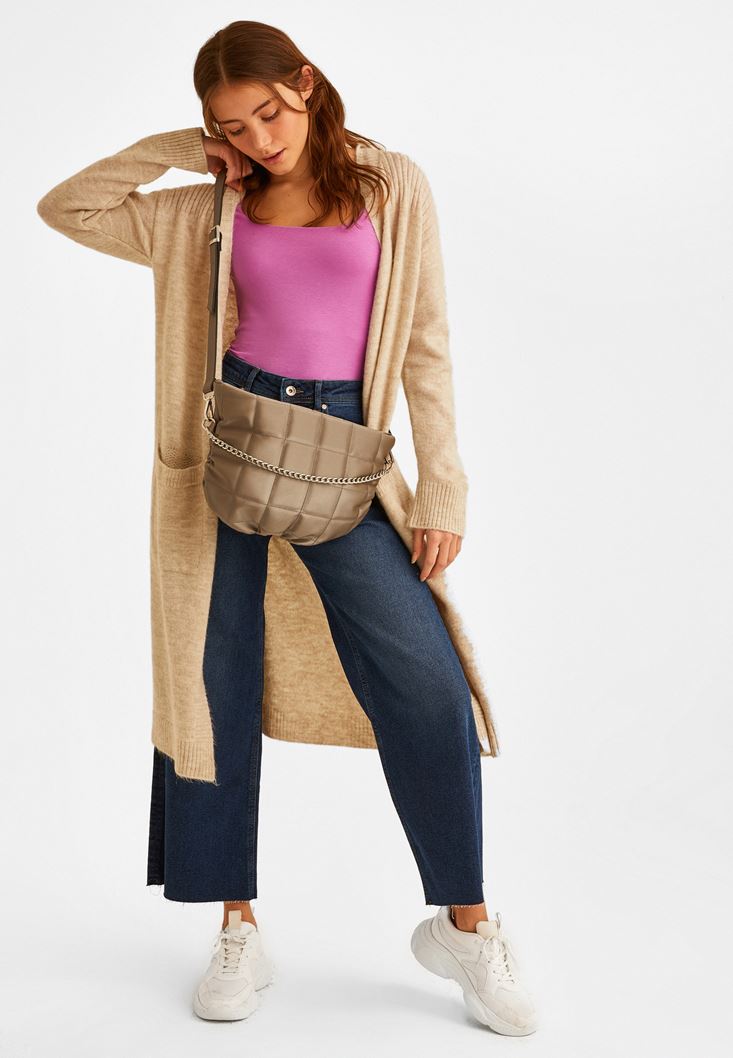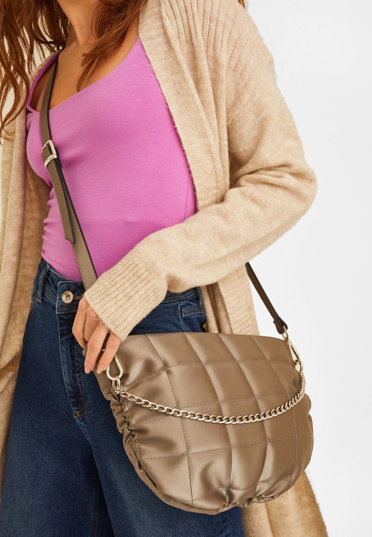 Zincir Detaylı Tote Çanta modeli, kapitone görünümü ve yumuşacık dokusu ile yeni sezonda sizlerle buluşuyor. Kol çantası modeli, askılı yapısı ve ön kısmında bulunan şık zincir detayı ile Oxxo'da ön plana çıkıyor. Kadın çanta modelini tarzınıza kolaylıkla adapte ederek gün içerisinde dilediğiniz gibi kullanabilirsiniz. Şişme  montlarla veya kot ceketlerle bir araya getirebileceğiniz kol çantası modelini kombinlerinize dahil edebilirsiniz. Kadın çanta modeli ile eşsiz bir uyum yakalamak için sneakerlardan da yardım alabilirsiniz. Oxxo'nun farklı detaylarla ve dikkat çeken görünümlerle sizlere sunduğu kol çantası modelleri ile siz de tarzınızı dilediğiniz gibi şekillendirebilirsiniz.