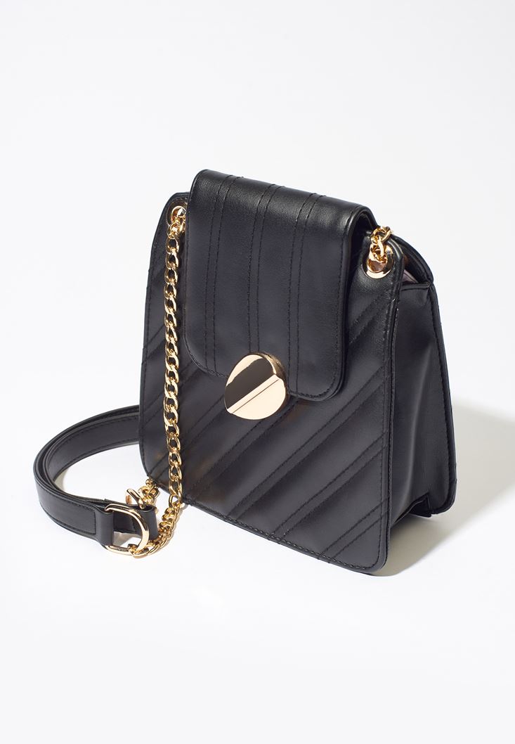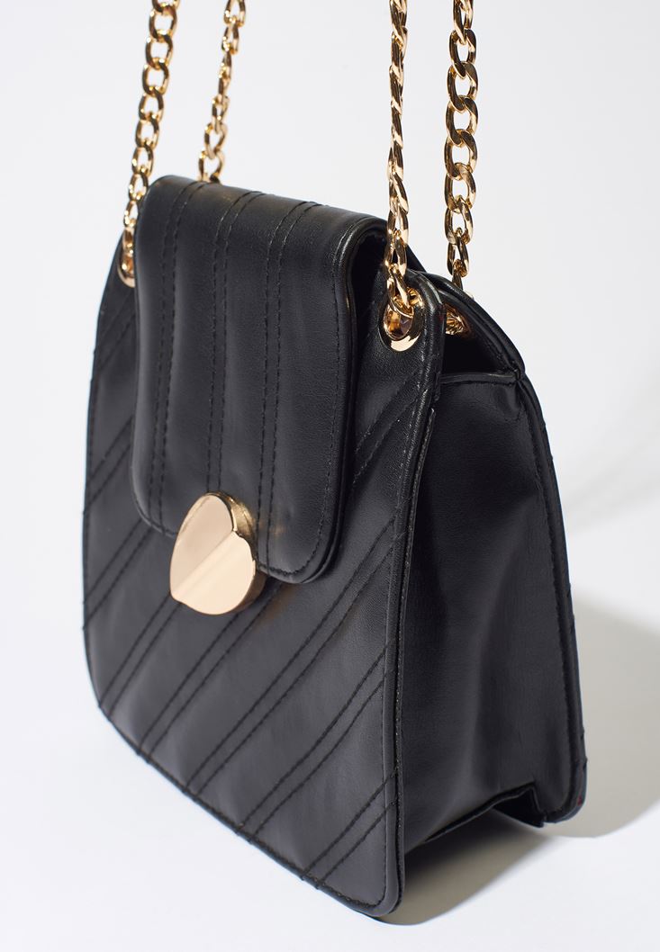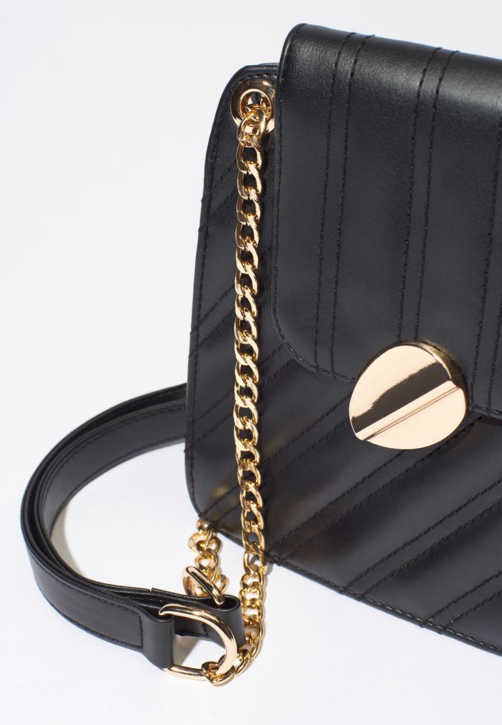 Kapitone dikişli vegan deri, yuvarlak toka tasarımı, vegan deri ve zincir detaylı askı.